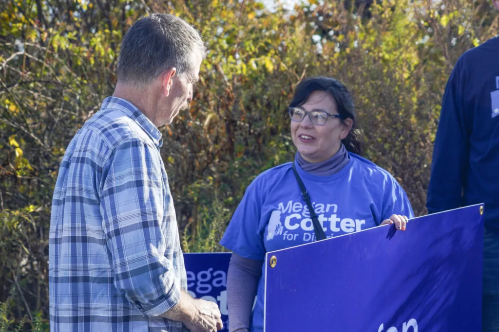 La representante Megan Cotter, una demócrata de Exeter, saluda al constituyente Chris Callaci mientras hace campaña el día de las elecciones del 5 de noviembre fuera de Exeter Chapel. (Foto de Laura Paton/Rhode Island Current)