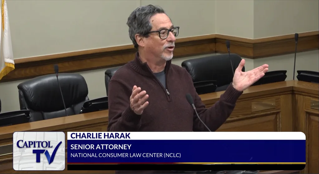 Charlie Harak, abogado principal del Centro Nacional de Derecho del Consumidor, habla sobre las protecciones de los contribuyentes durante un evento de panel en la Casa del Estado de Rhode Island el martes 11 de febrero de 2025. (Capitol TV Captura de pantalla)