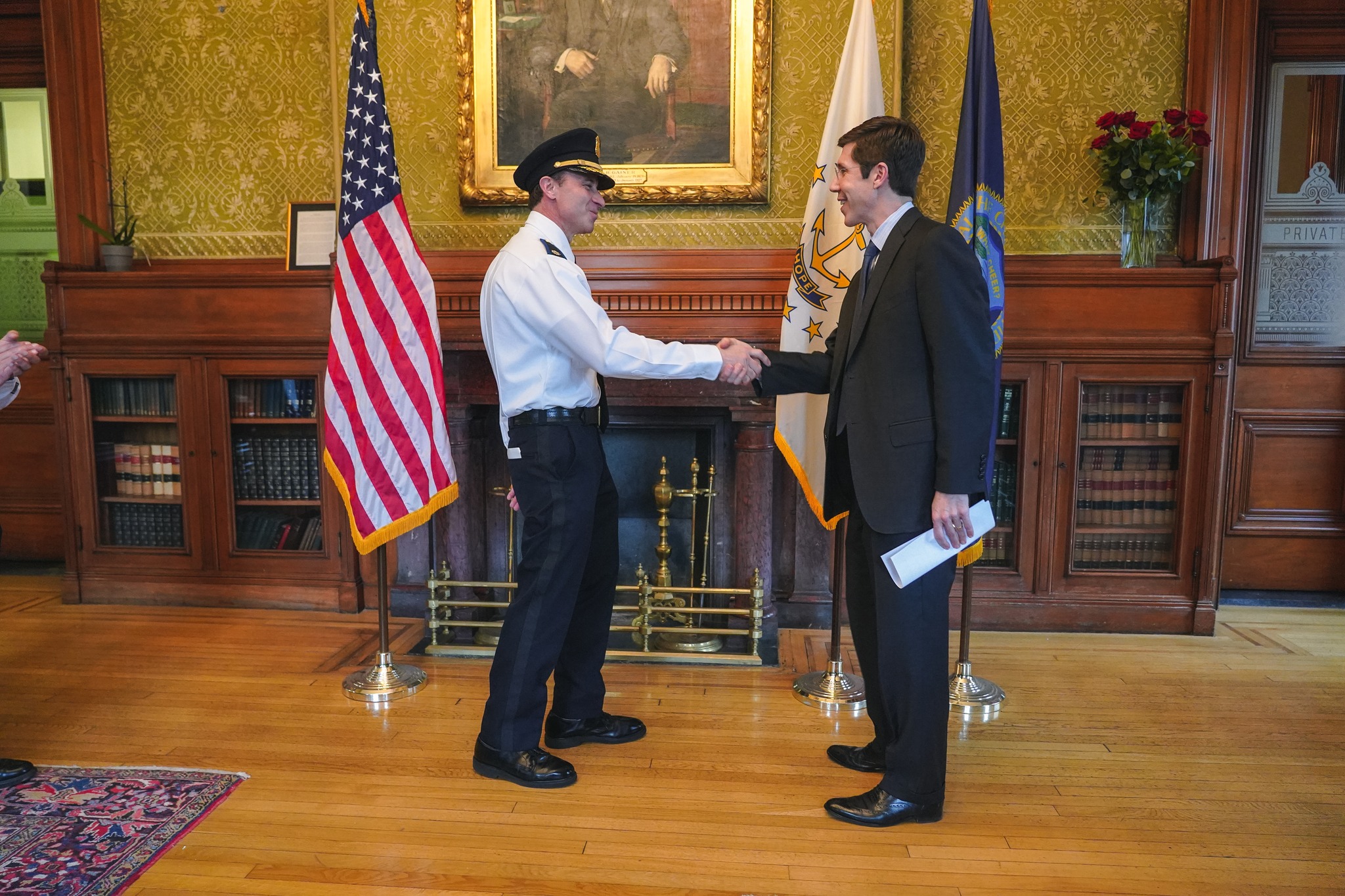 El alcalde Brett Smiley y el coronel Oscar Pérez anunciaron el viernes 17 de febrero de 2023 el nombramiento del mayor Kevin Lanni en el rango de sub-jefe del Departamento de Policía de Providence.