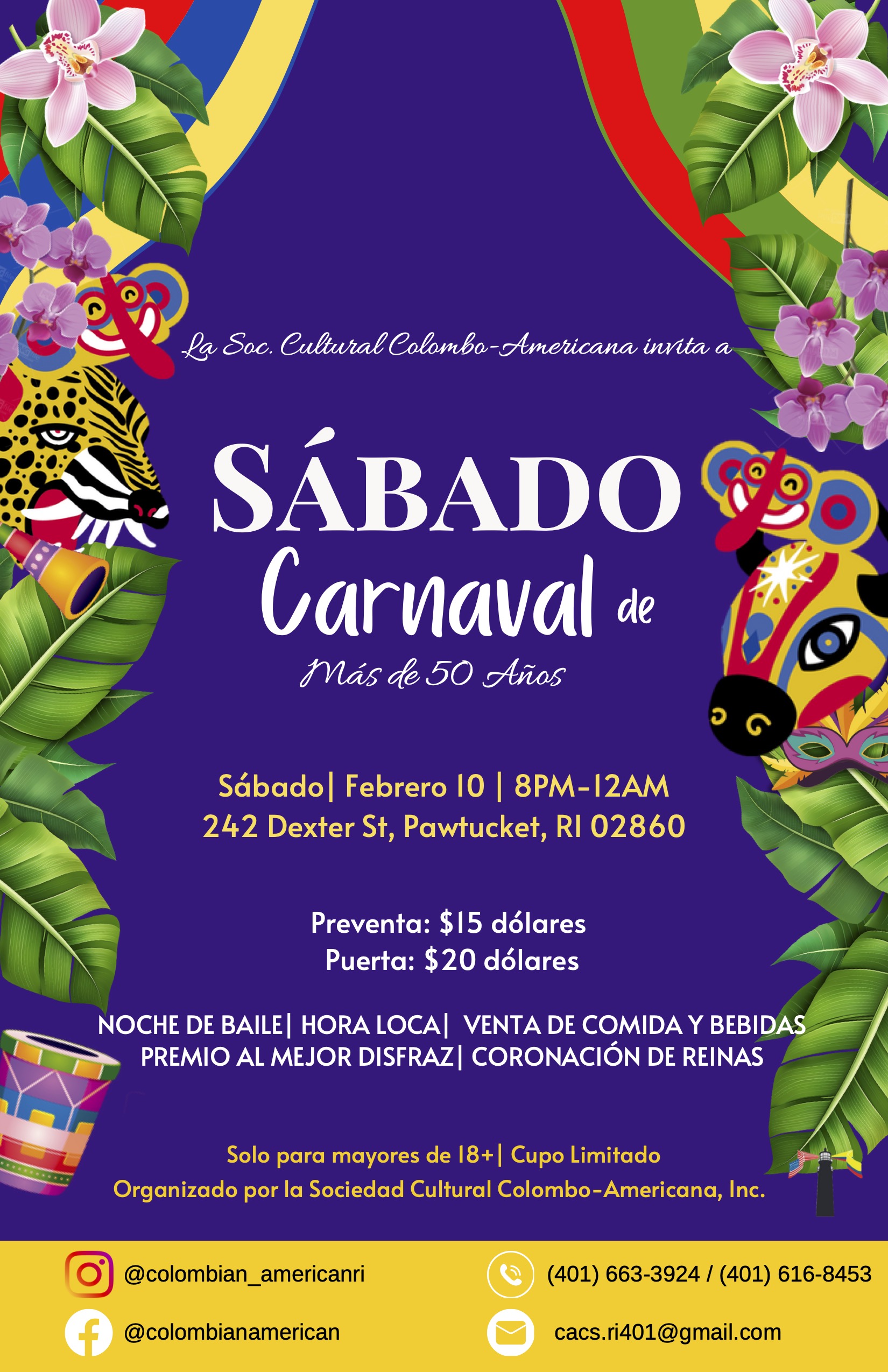 La Sociedad Cultural Colombo-Americana, Inc. (CACS) traerá de nuevo el Carnaval de Barranquilla a la comunidad de Rhode Island. El evento se llevará a cabo el próximo 10 de Febrero entre las 8:00PM y 12:00 AM, en las instalaciones de Tides Family Services ubicada en la 242 Dexter Street, Pawtucket (02860). La entrada- solo para adultos mayores de 18 años-  tiene un valor de $15 dólares hasta el 3 de Febrero, o $20 dólares en la puerta (hasta agotar existencias). Puedes asegurar tu boleta escribiendo al Instagram de la Sociedad @colombian_americanri, o como @colombianamerican en Facebook.